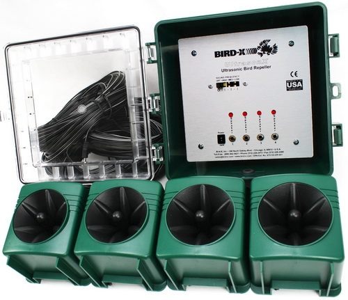 Промышленный ультразвуковой отпугиватель птиц "Ultrason X" укомплектован четырьмя выносными динамиками и в состоянии покрыть площадь в 340 м2. Прибор полностью бесшумен и эффективен против всех видов птиц (голубей, дроздов, воробьев, морских чаек, врановых, скворцов), а также мелких животных (грызунов и летучих мышей). Благодаря пыле- влагозащищенным корпусам и отпугиватель, и динамики могут работать на открытых объектах. Питается отпугиватель от сети 220 В или внешнего источника 12 В.