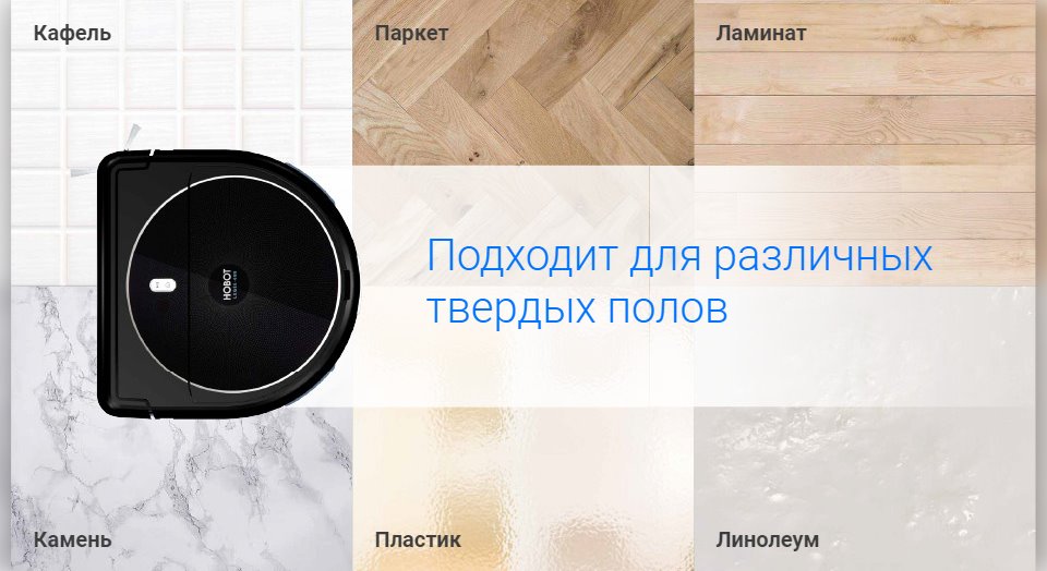 Робот убирает любые виды твердых напольных покрытий (паркет, керамическая плитка, линолеум, ковролин, ковры с невысоким ворсом). Анализирует и сам определяет вид напольного покрытия, подбирает оптимальную программу уборки, и выбирает нужный способ очистки от разных видов загрязнения.